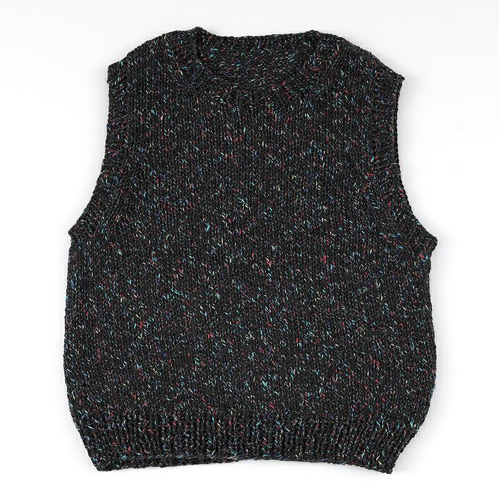 極太糸〈星の灯り〉で編むベストは、メリヤス編みをメインに袖ぐりの目立ての減目で美しいシルエットに。シンプルな編み地をカラフルな糸でキュートな仕上がりに。