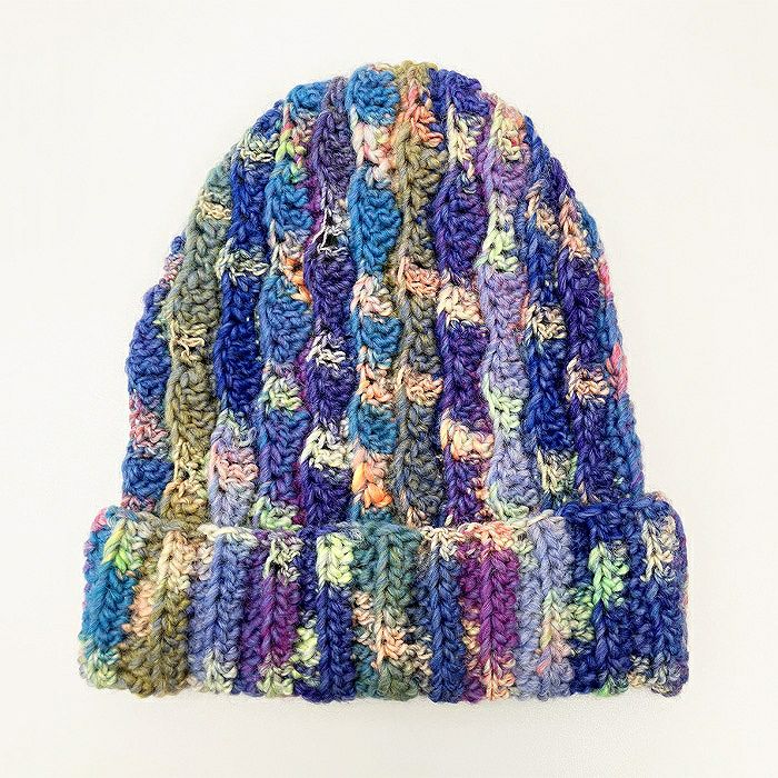 うね編みならではの立体的でぽこぽことした編地がかわいいニットキャップ。カラフルなネオンカラーの段染め糸が織りなす自然なグラデーションが冬のコーディネートに彩りを添えます。