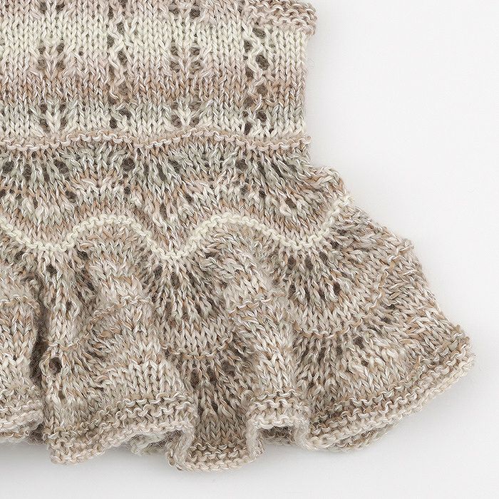 まず身頃を編んでから、裾から目を拾ってフリルをさらに裾に向かって編み進めるデザインが特徴のニットベスト。フリルと身頃には透かし模様が施され、華やかさが際立ちます。
