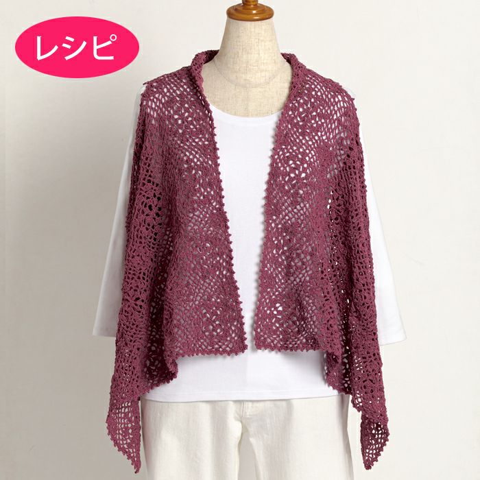 腕を通す部分をあけてモチーフを編みつないだ長方形のベストのレシピ(作り方シート)です。シャリ感のあるウール糸で編む、季節の変わり目に活躍するアイテム。ワンピースやシャツに重ね着を。