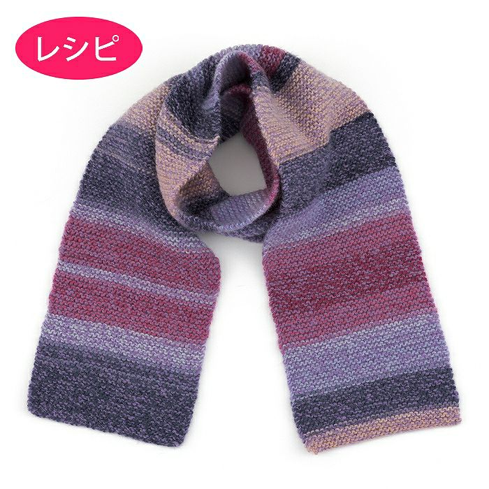 ロングピッチのかすり染め糸で編む、ランダムなボーダー模様のロングマフラーのレシピ(つくり方シート)です。ガーター編みで色の変化を楽しみながら真っ直ぐ編むだけなので、初心者にもおすすめ。