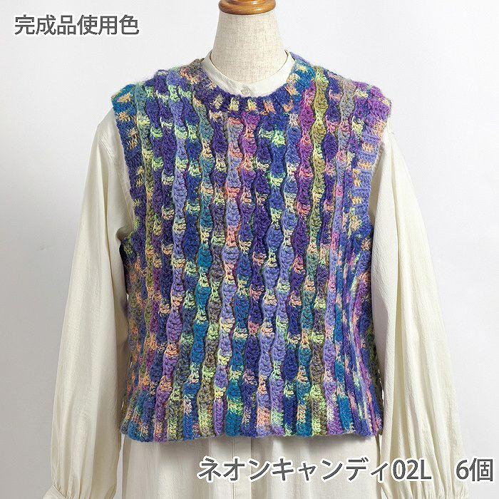 波のようなぽこぽこした立体的な模様と、カラフルなネオンカラーの段染め糸が織りなす自然なグラデーションが可愛いニットベスト。見た目も編むのも楽しい一枚に仕上がります。
