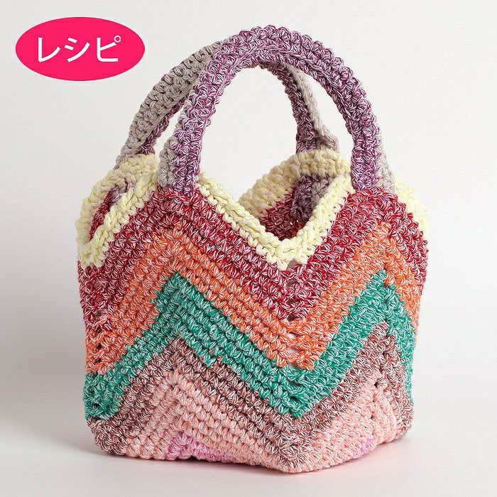 10色の糸が楽しめる〈ツイストリース〉1カセで編み上がるバッグのレシピ(つくり方シート)です。底からぐるぐる細編みで増減しながら編み進めていくだけ。お財布や小物を入れて、ちょこっとおでかけバッグに。