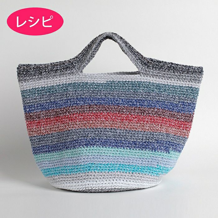 細編みで編み進めていけばカラフルなボーダー柄が完成するのレシピ(つくり方シート)です。持ち手も同時に編み上がる人気のデザインを〈ツイストリース〉提案。収納力があるので、メインバッグとしても大活躍。
