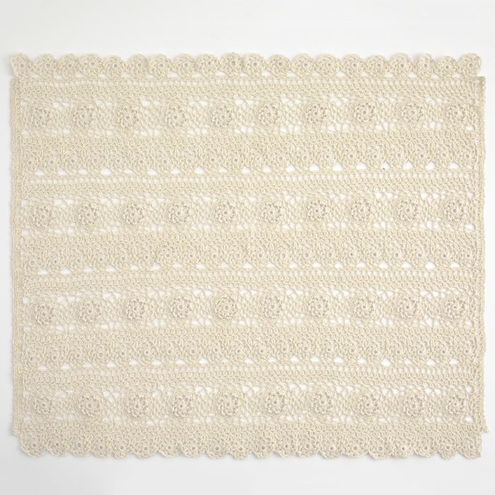 シルク風の光沢が美しいレース糸で編むブランケット。大小の花モチーフを編みながらつなぎ、スカラップ風の縁編みで仕上げます。涼しげなひざ掛けやインテリアアイテムに。