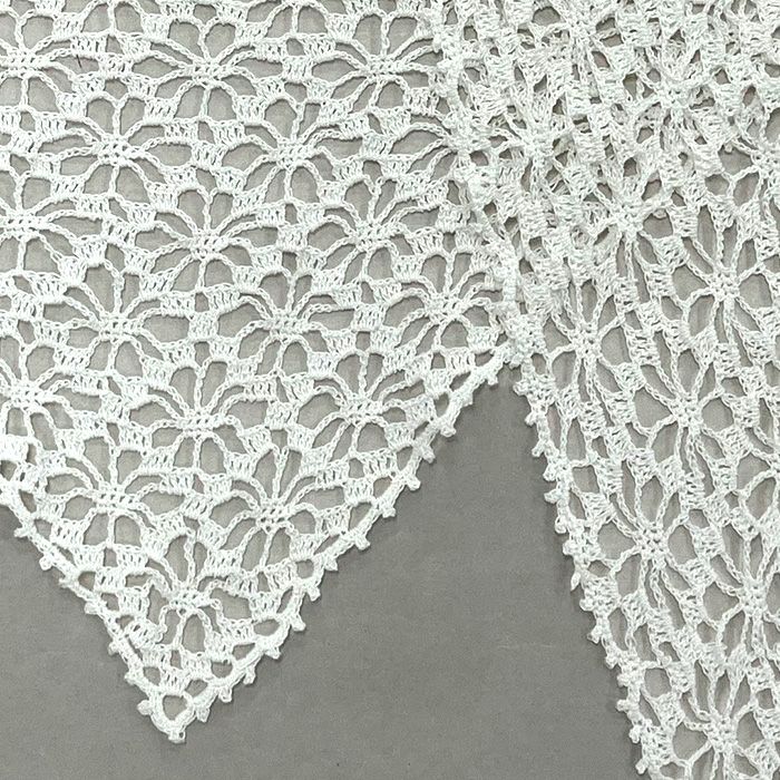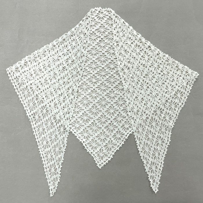 極細コットン糸で編む、透かし編みのスカーフ。鎖編みと長編みで完成する簡単な模様編みで三角形を仕上げたら、周囲に縁編みを。首元を春らしく軽やかに彩るアイテムです。