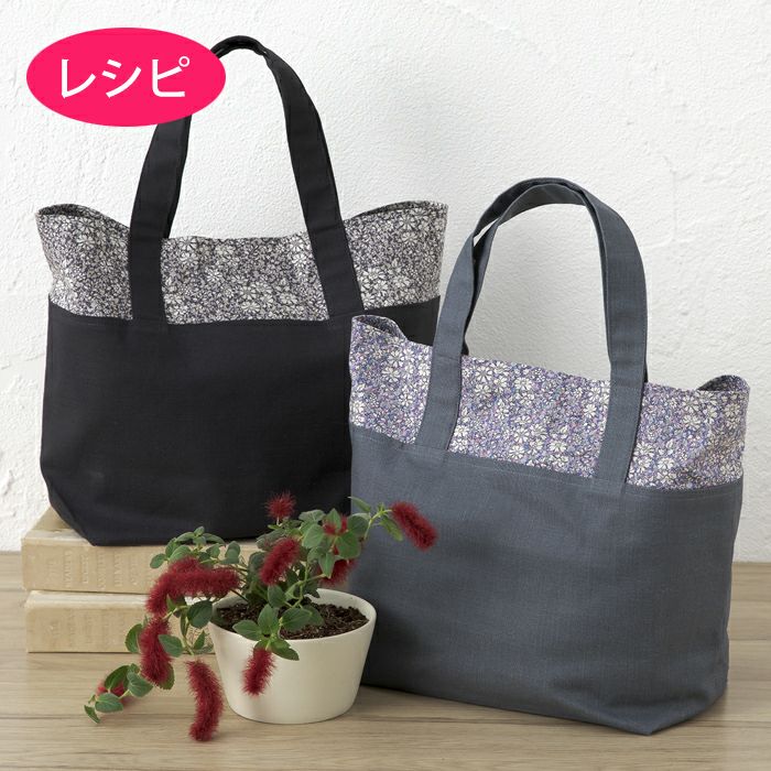 実用的なバッグとプリント柄の組み合わせが新鮮なトートバッグのレシピ(作り方シート)です。スラブコットンとプリント柄の切り替えづかいがデザインポイント。