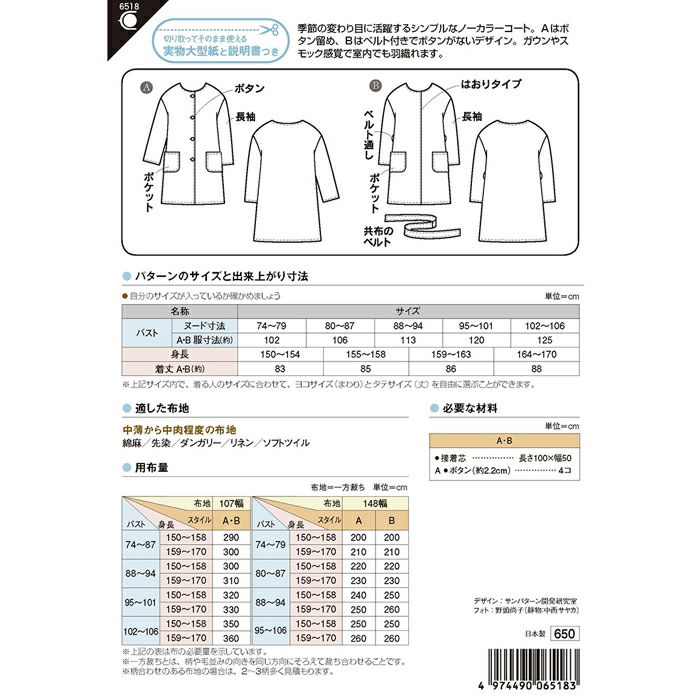 商 品ノーカラーライトコート(型紙)