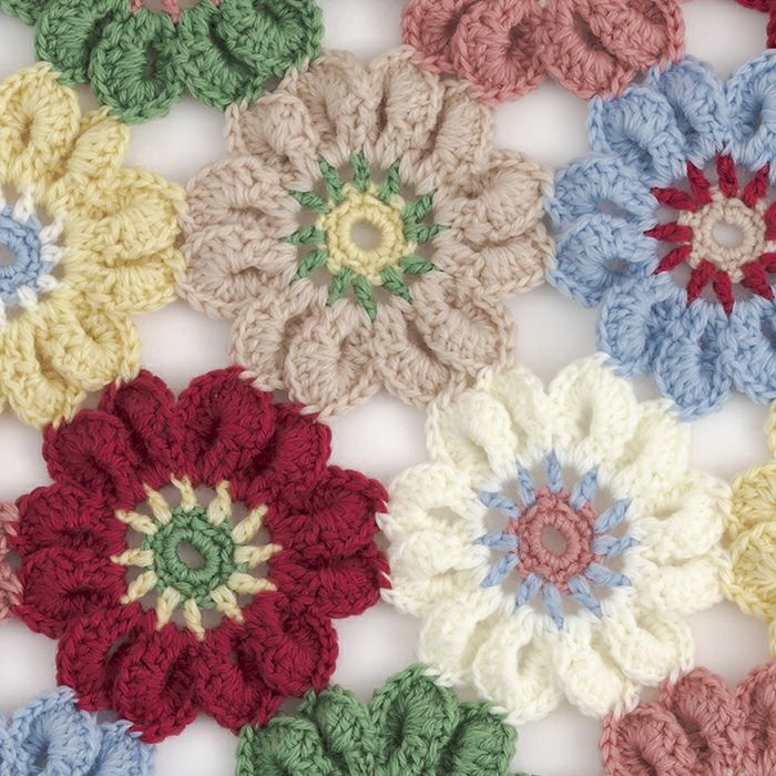 立春の頃から咲き始めるアネモネをイメージしたフラワーモチーフを、7色の糸で編みながらつないでいくカラフルなブランケット。インテリアのアクセントに。