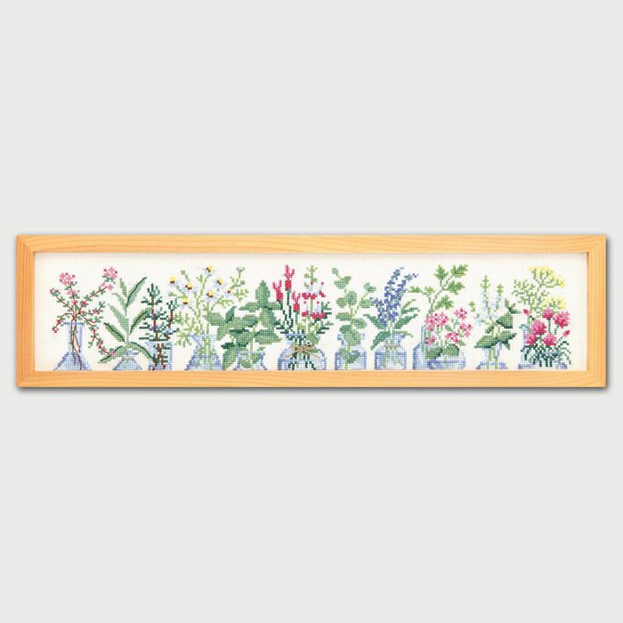 摘みとったばかりのハーブをガラス瓶に挿した涼しげな情景をクロスステッチでみずみずしく表現するフレーム。どこにでも飾ることができて、ハーブの並ぶ細長い小窓が出来上がります。