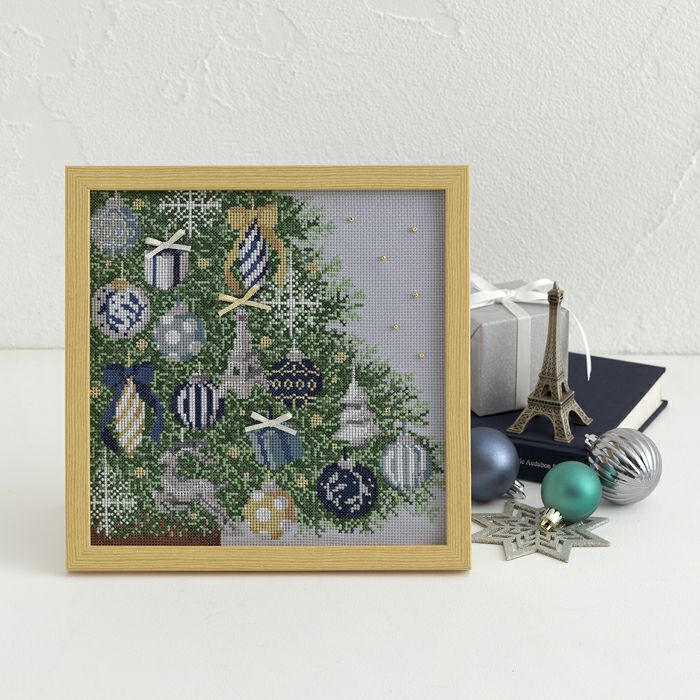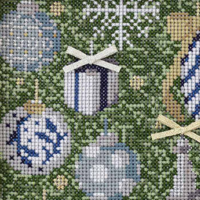ブルー系とシルバーのオーナメントで飾りつけたシックなツリーの一部をクローズアップ。もみの葉の陰影と奥行きをグリーンの濃淡で刺し、ラメ糸で上品さをプラス。