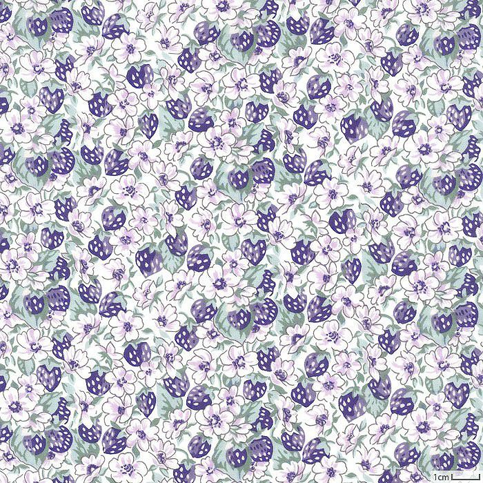 いちごのカラーが、濃い紫色で、白い花びらの中の一部がラベンダーカラーになっていて、イチゴのカラーとのコントラストが、きれいで素敵な生地ですね。 お弁当包みを作るのが楽しみです。