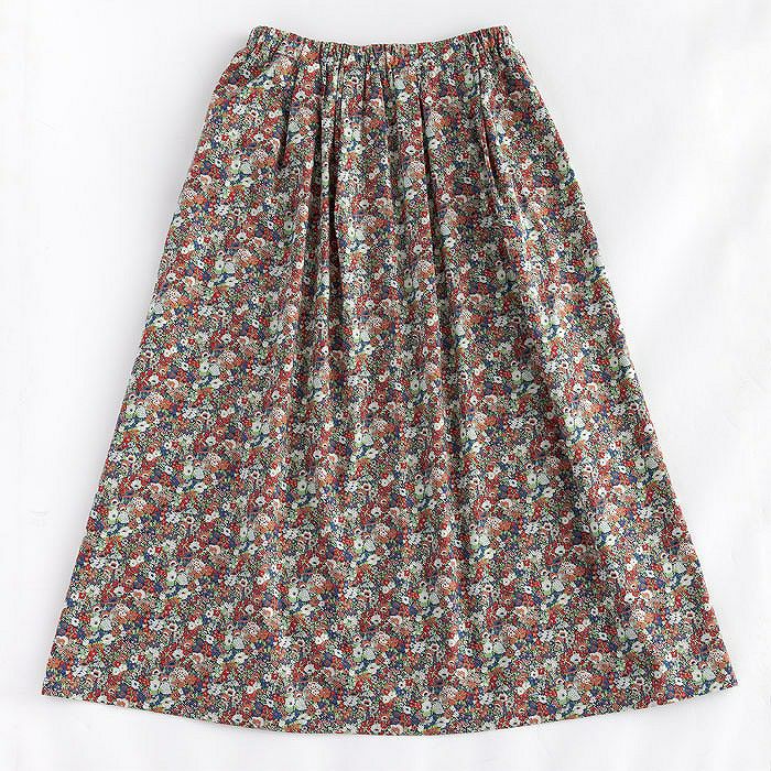 前後に入れた8つのタックがふんわりボリュームを出しているウエストオールゴムのギャザースカート。
