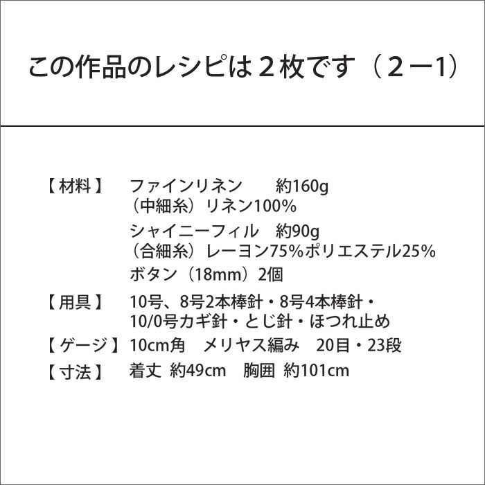 リネン糸とラメ糸を引き揃えて編む、清涼感のあるベストのレシピ(作り方シート)です。とじないままの前後身頃の両脇を、ベルト状のひもでボタン留めして着用します。サイドベルトが着こなしの可愛いアクセントに。
