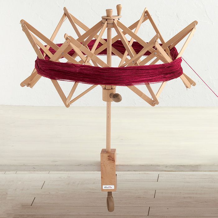 かせ糸をセットして、回転させてボールワインダーに送ります。スピーディでスムーズな回転です。