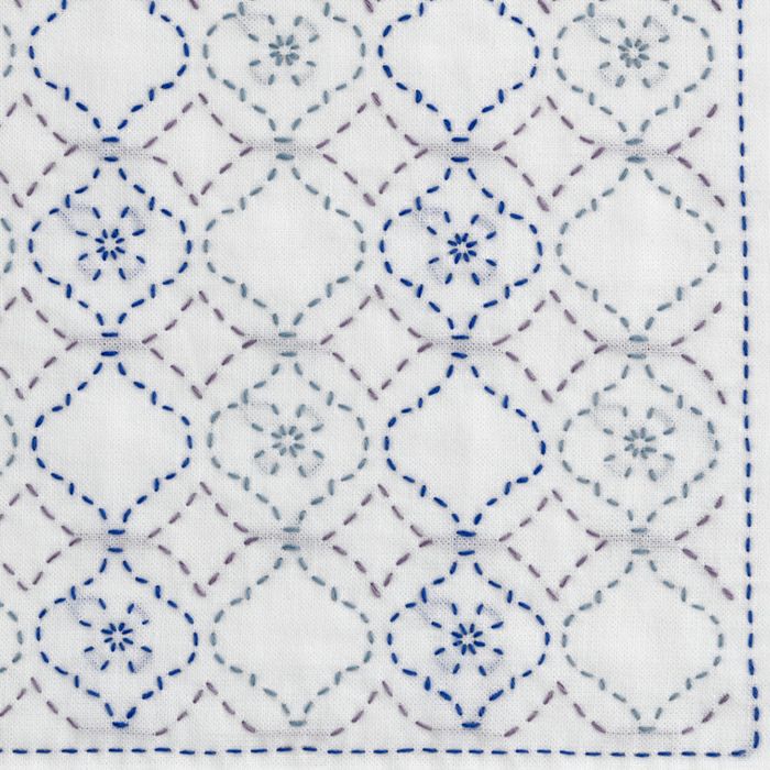 曲線が美しいエキゾチックなタイル模様をモチーフにしたデザイン。涼しげな3色の刺し子糸の組み合わせは、キッチンやサニタリールームなどでもおしゃれに使っていただけます。