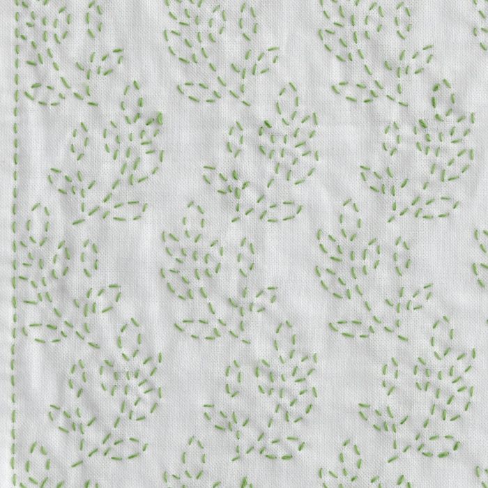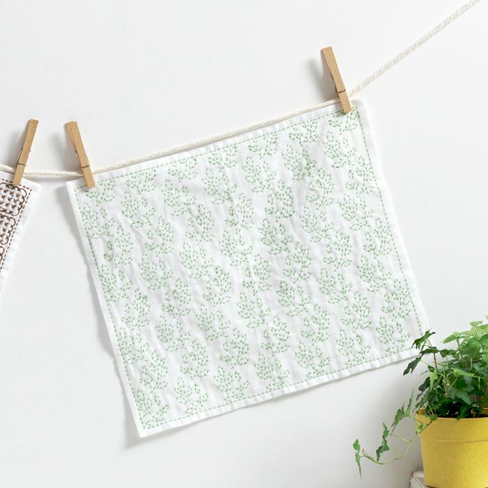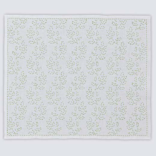春風にそよそよと揺れる若葉を表現したデザイン。芽吹いたばかりのフレッシュな新芽を、明るい黄緑色の刺し子糸で刺し上げます。春先のランチクロスなど、使い方はいろいろです。