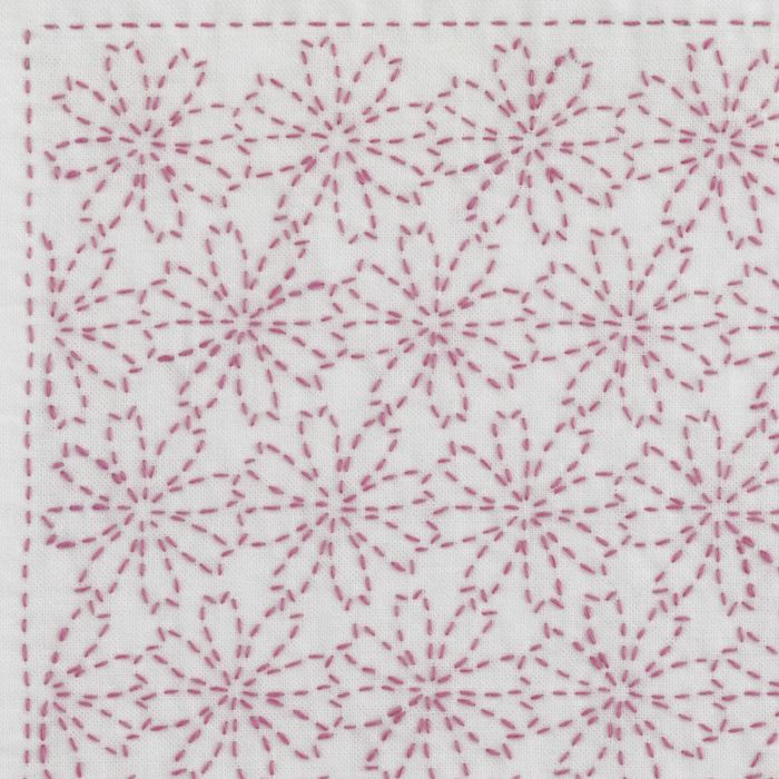 可憐なコスモスの連続模様。花を半分ずつ左右交互に刺し進め、花の形を仕上げていきます。残暑を労う気持ちを込めたギフトにも。チェリーピンクの刺し子糸でご提案しています。