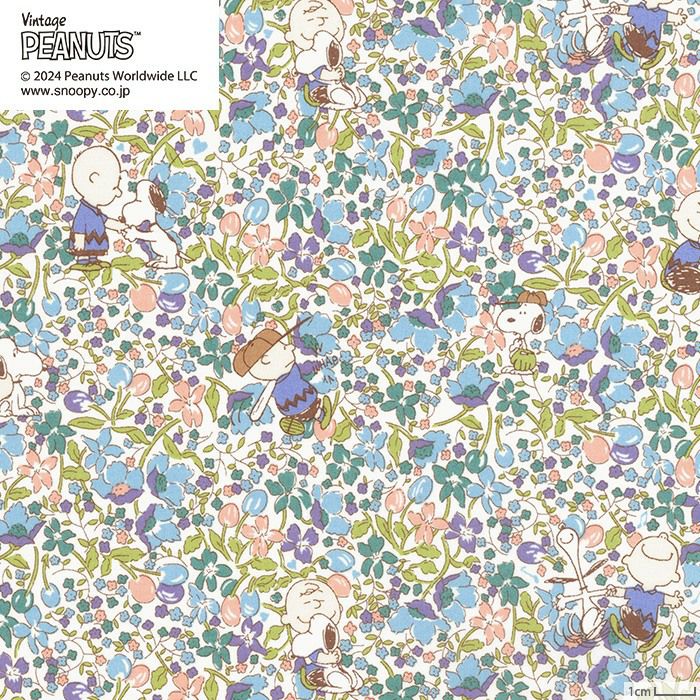 可愛らしいキャラクターたちの個性を活かすためにセレクトしたリバティらしいフローラルデザインや、カンバセーショナルデザインを背景に、60年代から70年代のコミックから厳選したピーナッツのなかまたちがチャーミングに描かれています。記念すべきコラボレーションの全4柄をお楽しみください。
