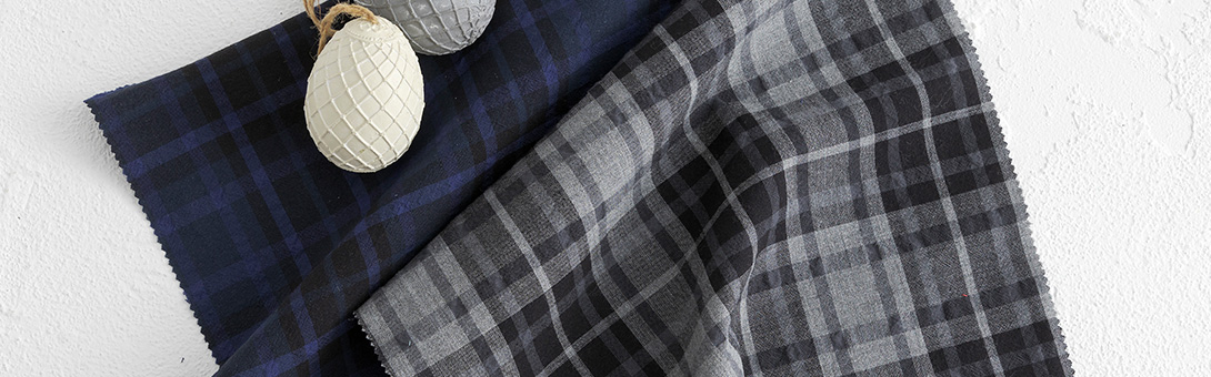 縦横に凹凸が入った洗練された先染めサッカー〈ワントーンチェック〉。適度な厚みとハリがあり、暑さが残る季節におすすめ。