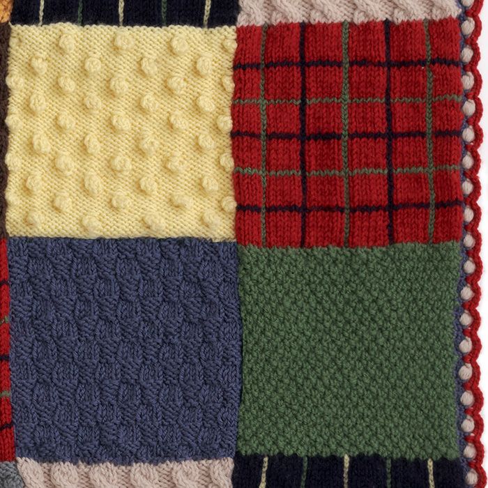 チェック柄、なわ編み、かのこ編みなど、5種類の四角モチーフをパッチワーク状に編みつないだブランケット。ブリティッシュテイストの色と伝統模様が秋のインテリアによく映えます。