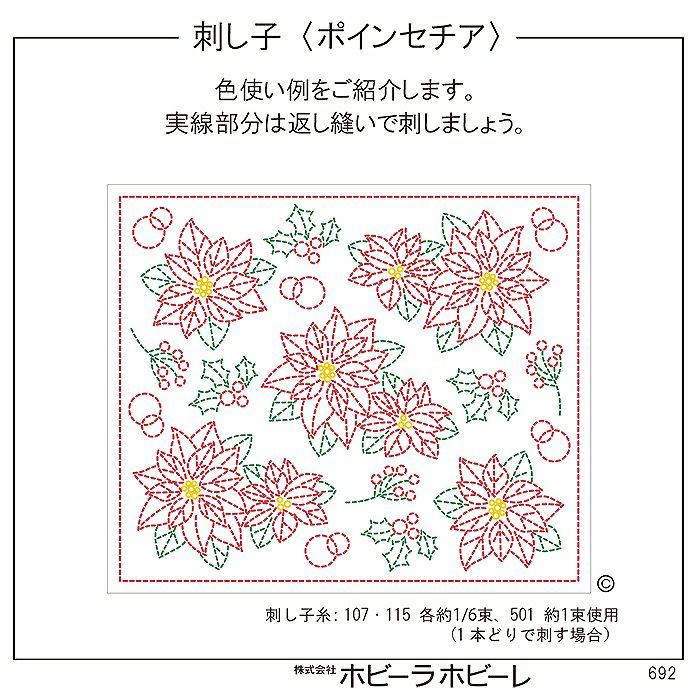ポインセチアをメインにヒイラギやヤドリギを組み合わせたクリスマス向けのデザイン。赤系刺し子糸にはラメ入りのシャイニーレッドを使って、スペシャル感のある仕上がりに。