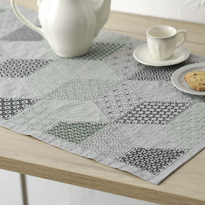 グレー地のスラブコットンに6色の刺し子糸で菱形を立方体に見えるように刺し分けます。多様な図案を楽しめるおしゃれクロスで、テーブルや飾り棚をシックに模様替え。