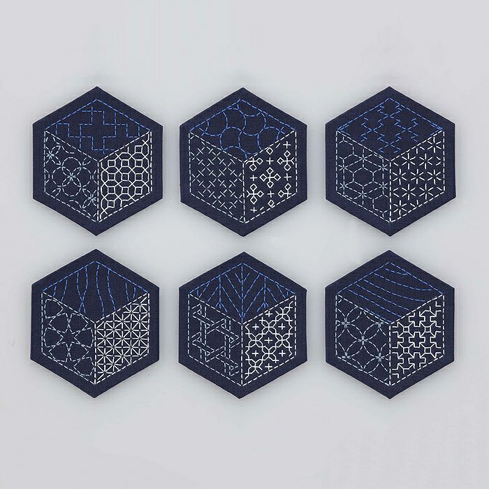 六角形の土台布の中に3色の刺し子糸と図案で3面を刺し分け、立方体を表現する6枚セットのコースター。1枚に3柄が組み合わされ、どこでも手軽に刺し子が楽しめます。