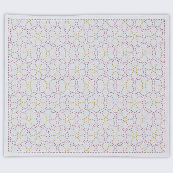 ふきん全面に花びら6枚の花を敷き詰めた可愛いデザイン。2色の刺し子糸で刺すことで、丸みのある花のフォルムが際立ちます。いっせいに花咲く春の野原のような刺し子ふきんです。