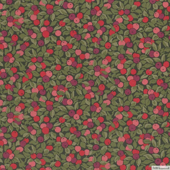 元々は1966年にリバティのために制作されたかわいらしいフルーツのデザインですが、恐らく1930年代の古いアーカイブプリントにインスパイアされています。小さくてジューシーなベリーが葉を背景に蜜にレイアウトされ、全体に繰り返されています。