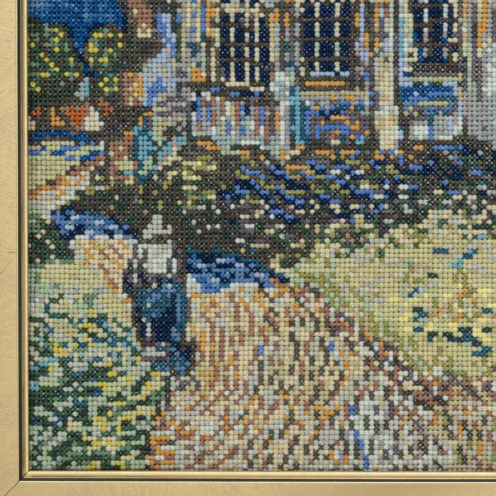 パリのオルセー美術館所蔵のゴッホ最晩年の代表作『オーヴェルの教会』をクロスステッチ。力強い筆致で描かれた、コバルト色の空、石造りの教会、分かれ道を全面刺しで再現します。 芸術に没頭する贅沢な時間を味わえる一品です。
