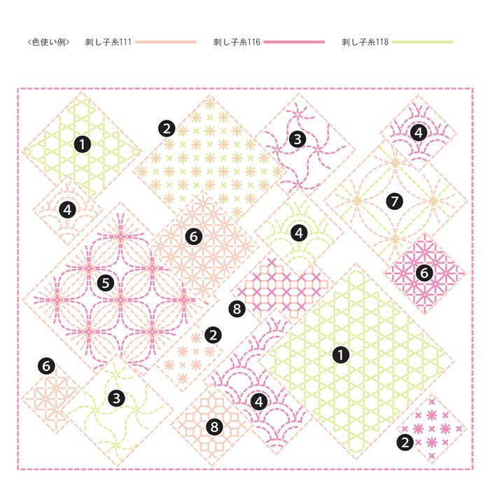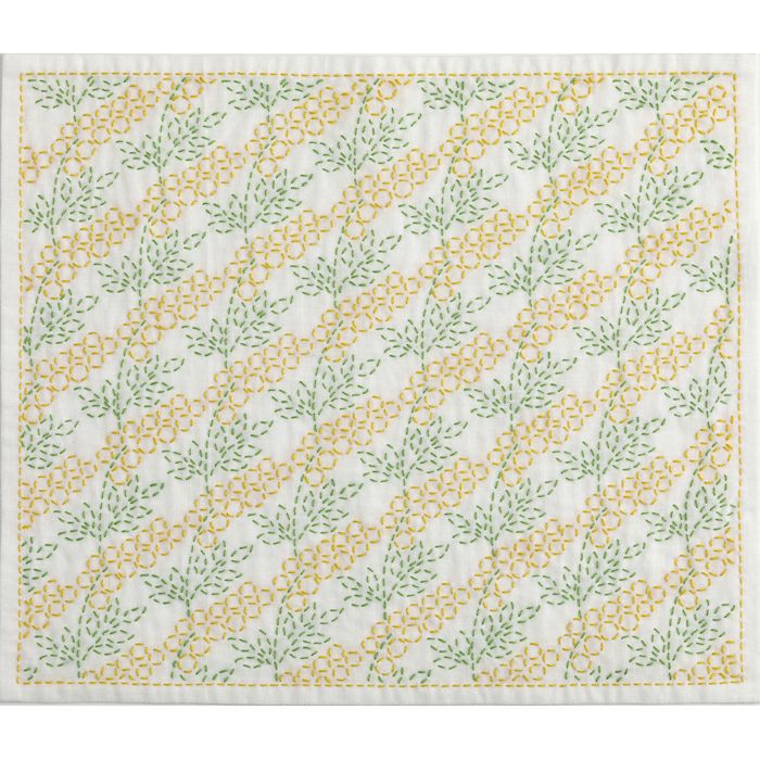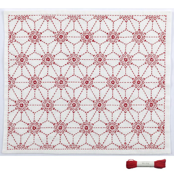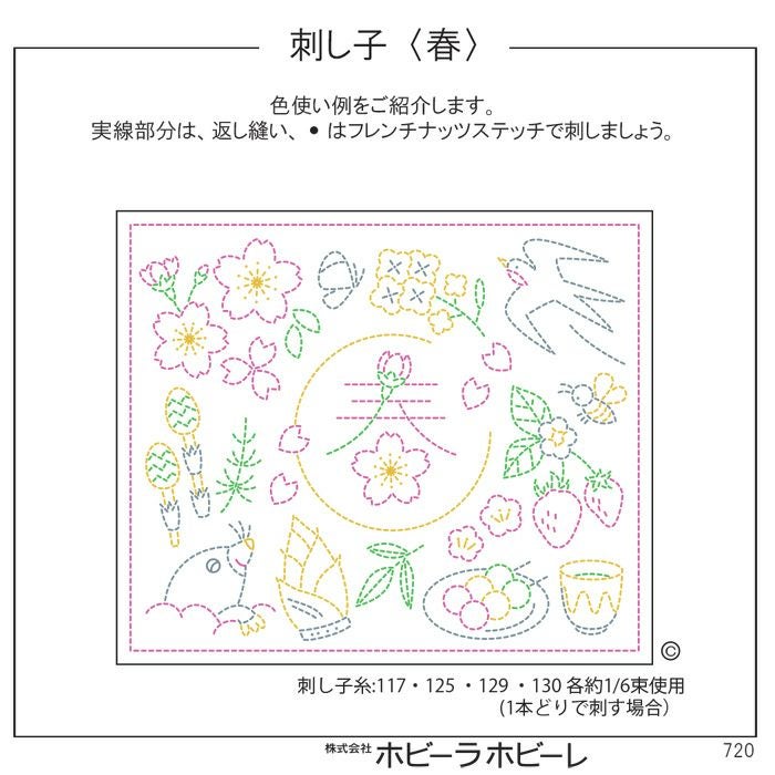 1 枚仕立ての刺し子クロス〈菖蒲と兜〉、春を模した飾り漢字が入る〈春〉、伝統柄を散りばめた寄せ模様 〈角がさね〉、絹糸で仕上げる〈丸模様〉、紺地に映える3 色の糸で仕上げる〈変わり麻の葉Ⅲ〉をお届け。