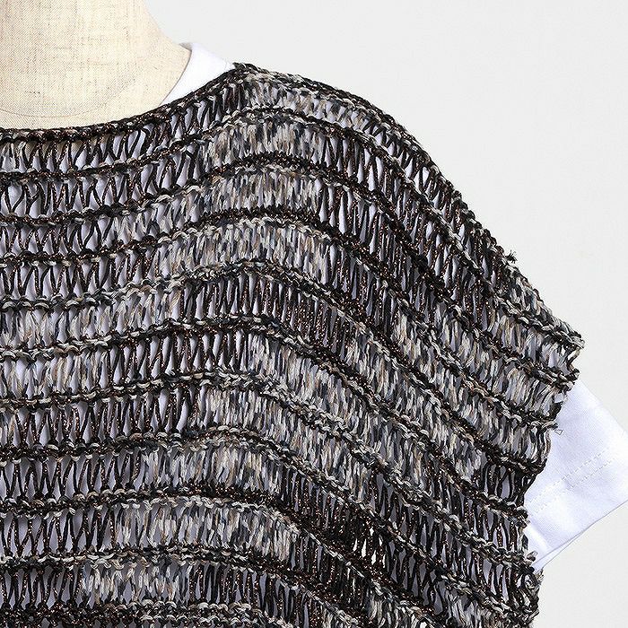 身頃をドライブ編み、裾をゴム編みでまっすぐ編み、前後身頃の肩と脇を閉じるだけ。控えめなラメの輝きと透け感のあるしなやかな着心地が魅力のおしゃれベストです。
