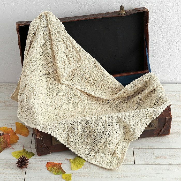 上質な合細コットン糸2本どりで編むブランケット。4種のアラン模様をパッチワーク状に繋いだような仕上がりがポイント。インテリアに合わせやすいオフホワイトで編み上げます。