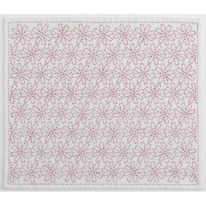 可憐なコスモスの連続模様。花を半分ずつ左右交互に刺し進め、花の形を仕上げていきます。残暑を労う気持ちを込めたギフトにも。チェリーピンクの刺し子糸でご提案しています。