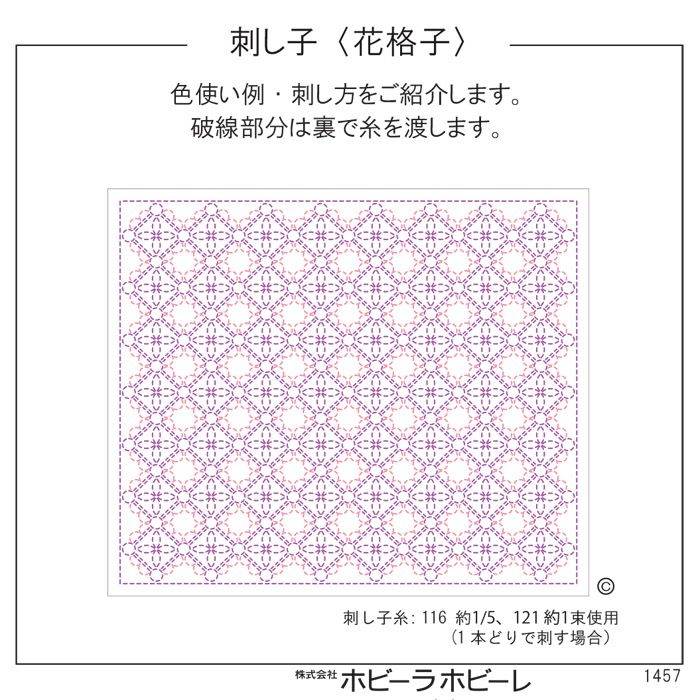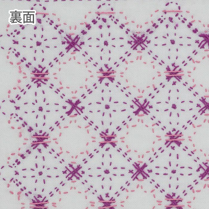 2種類の花モチーフを格子状にアレンジしたかわいいオリジナル図案。季節を問わないピンク&パープル系の配色で華やかな仕上がりに。初級者から楽しめるオリジナルの伝統柄です。