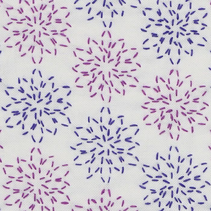 紫系の刺し子糸を使い、全面を八重の花柄で刺し埋める華やかなオリジナルの伝統柄。花びらのつながりが亀甲風にも見えてくるデザインは、季節を問わずお使いいただけます。