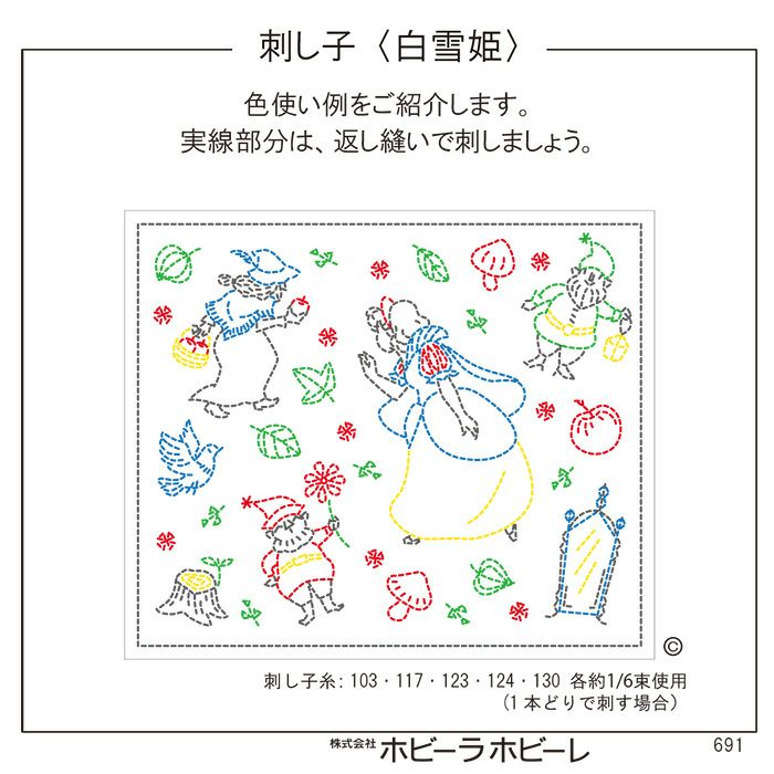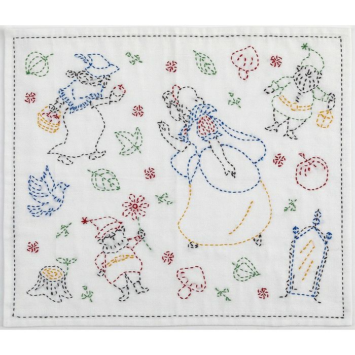 グリム童話『白雪姫』の物語世界を刺し子で楽しむデザイン。白雪姫と小人たち、毒りんごを持つ魔女などの登場人物、魔法の鏡や森の植物などをカラフルに刺し分けます。