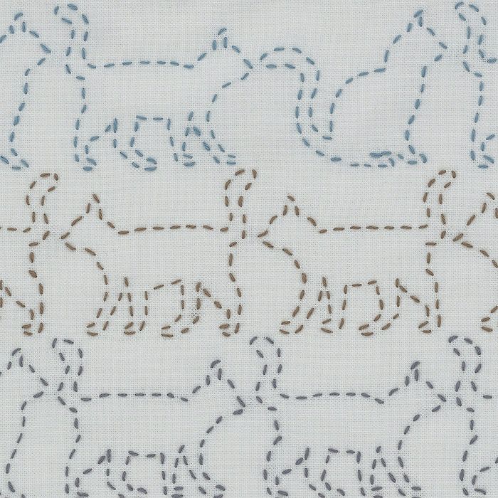 歩いたり座ったりしているねこを一列ごとに色を替え、一筆書きのようにシルエットを表現するシンプルデザイン。幅広い用途に使える、落ち着いた3色の刺し子糸で刺し上げます。