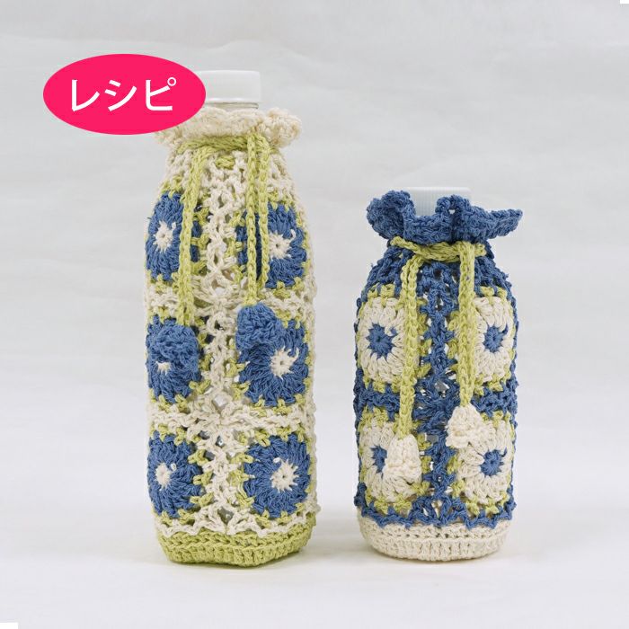 シャリ感のある3色のコットン糸で編む、モチーフつなぎのボトルホルダーセットのレシピ(作り方シート)です。MSサイズの配色を替えて、さり気ないペア感が楽しめます。初心者にも編みやすい花小物です。