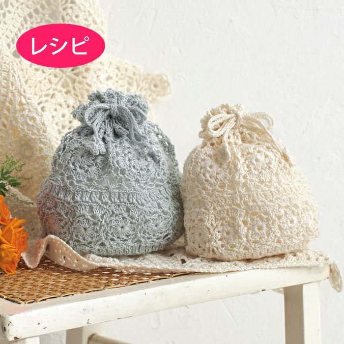 上質なレース糸1玉で編む、レース編みのポーチのレシピ(つくり方シート)です。花モチーフをつないだ側面と丸底で形づくる巾着形。優雅な気分を演出するおしゃれな小物入れです。