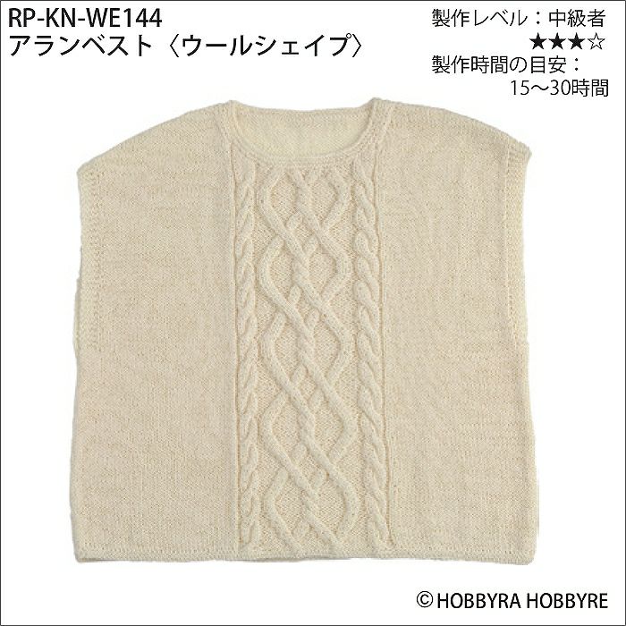 前身頃のアラン模様がアクセントのベスト。後身頃はメリヤス編みですっきりとしたデザインです。初秋まで活躍する、重ね着向けアイテムです。