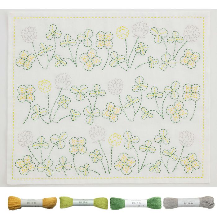 ボーダー状に3列並んだクローバーとシロツメクサを4色で刺し分ける愛らしいデザイン。葉と茎に使用しているグリーンはなるべく続けて刺していき、他の3色はモチーフごとに糸始末をしながら仕上げます。