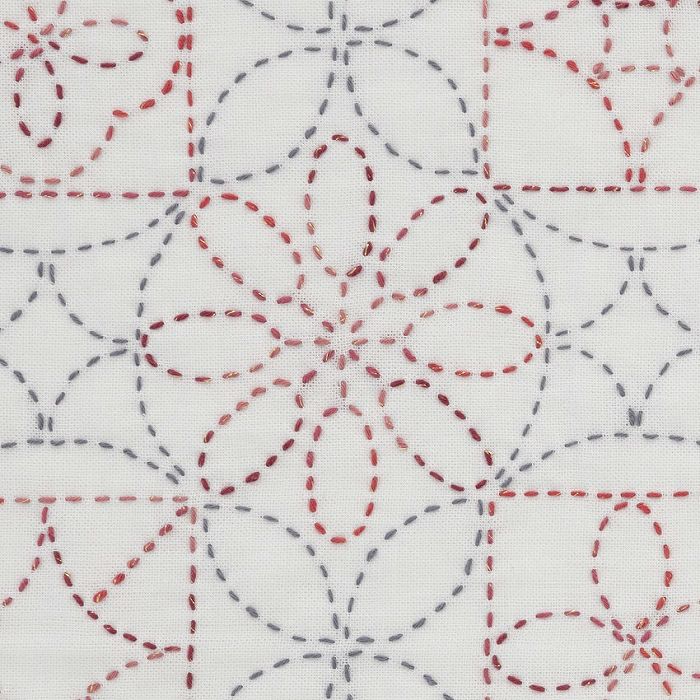 2色の刺し子糸を使って、シンプルな幾何学模様が重なり合うデザインを楽しく刺し上げます。赤系刺し子糸にはラメ入りのシャイニーレッドを使用。初心者にも刺しやすい図柄です。