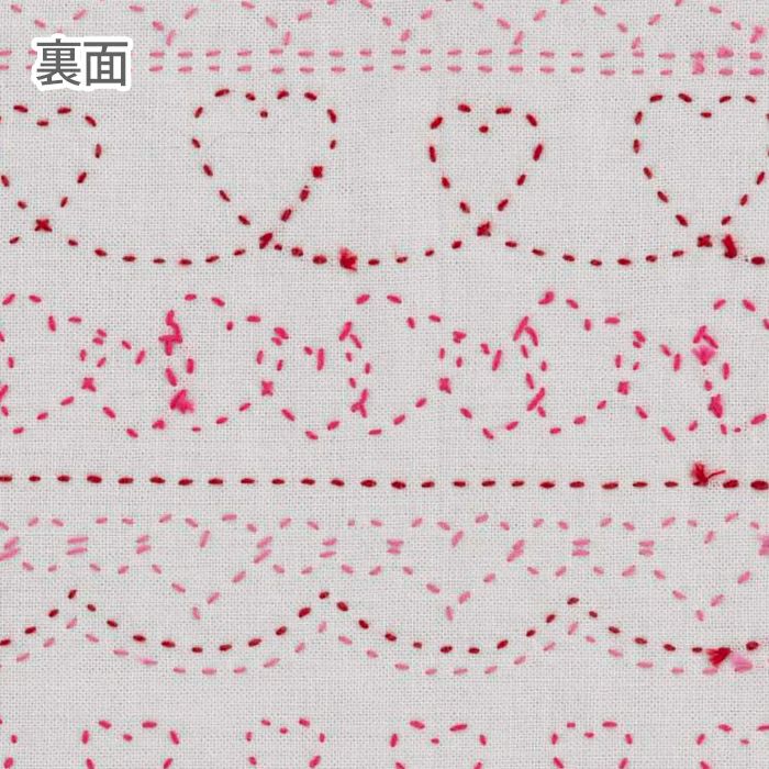 ラブリーなピンク系の刺し子糸3色で、レース模様のようなハートの連続柄を表現。1列ごとに変化するハート模様が楽しめます。オールシーズン使うことができる可愛い刺し子です。