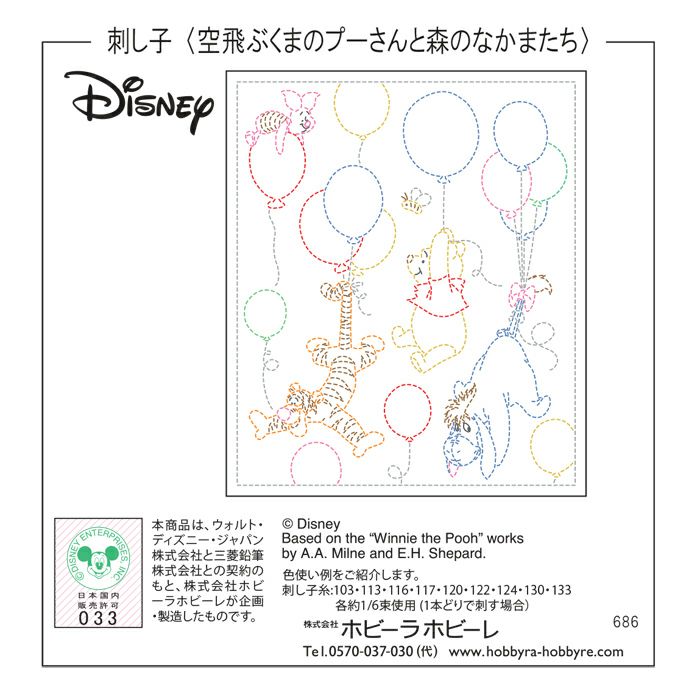くまのプーさんと森のなかまたちが、カラフルな風船にぶら下がって空を飛ぶ楽しいデザイン。9色の刺し子糸でイラストを描くように刺していきます。プーさんファンへのギフトにも。