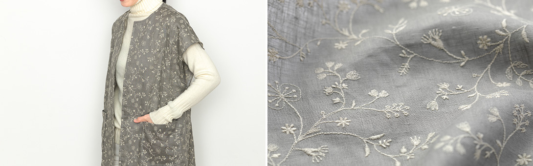 やわらかく上質なリネン地に、繊細なボタニカル刺しゅうを施しました。上品 な光沢をまとうお洋服におすすめ。手洗いできるのもうれしいポイントです。