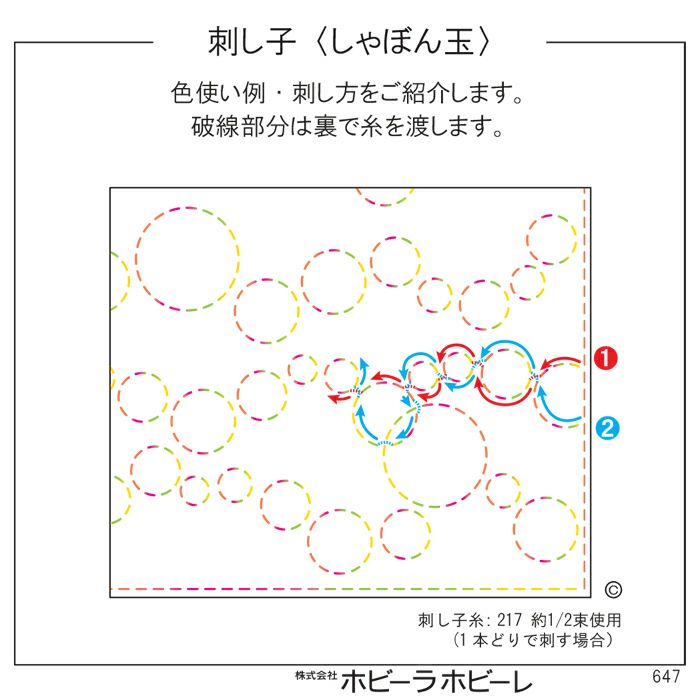 1種類のネオンカラーミックス糸だけで横に並んだ大小の丸模様を刺していくデザイン。風に吹かれて浮かぶシャボン玉のような動きが楽しい。様々な用途に使えるモダンで可愛い布巾です。