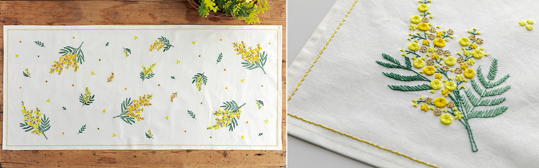 人気の「ミモザ」シリーズに、多彩なフランス刺しゅうが楽しめるテーブルセンターと、満開のミモザを表現した縦長のフレーム、 ふんわりと束ねた花束をオーバル型の刺しゅう枠に収めたクロスステッチフレームが仲間入り。ミモザのポーチも復刻します。