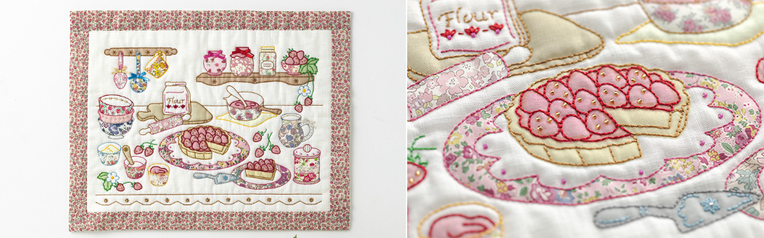 いちごのケーキやお菓子作りの様子を、リバティプリントをふんだんに使ったアップリケタペストリーに。 さらにいちごのスイーツを集めたクロスステッチタペストリーが新登場。いちごのポーチはカギ針編みで。